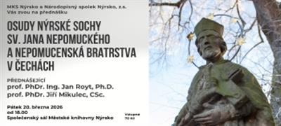 Již tento pátek 20. března od 18.00 ve společenském sále městské knihovny v Nýrsku sejdou dva profesoři historie, kteří nám povypráví o osudech nýrské sochy sv. Jana Nepomuckého a o Nepomucenských bratrstvech. V roce 1736 byla nýrským Nepomucenským bratrstvem u kostela Čtrnácti svatých pomocníků na nýrském dolním náměstí osazena socha sv. Jana Nepomuckého. Co se později stalo se sochou, a jaká byla její cesta na dnešní místo, se dozvíme v přednášce prof. PhDr. Ing. Jana Royta, Ph.D., DSc. Zmíněny budou i další svatojánské památky z Nýrska a okolí, které patří k typickým atributům české krajiny. Prof. PhDr. Jiří Mikulec, CSc. seznámí posluchače s náboženskými bratrstvy zasvěcenými sv. Janu Nepomuckému v barokních Čechách. Nenechte si ujít tuto vzácnou příležitost a přijďte si poslechnout zajímavé přednášky našich předních historiků vztahující se k našemu městu.